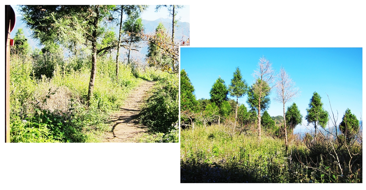 踏上有著木圍欄的階梯、走過緩坡山路、經過石頭門...