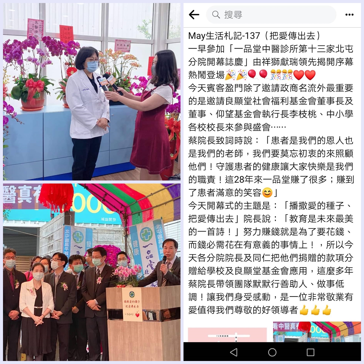 今天開幕式的主題是:「播撒愛的種子、把愛傳出去」院長說:「教育是未來最美的一首詩!」努力賺錢就是為了要花錢、而錢必需花在有意義的事情上!所以今天各分院院長及同仁把他們捐贈的款項分贈給學校及良顯堂基金會應用,這麼多年蔡院長帶領團隊默默行善助人、做事低調!讓我們身受感動,是一位非常敬業有愛值得我們尊敬的好領導者。